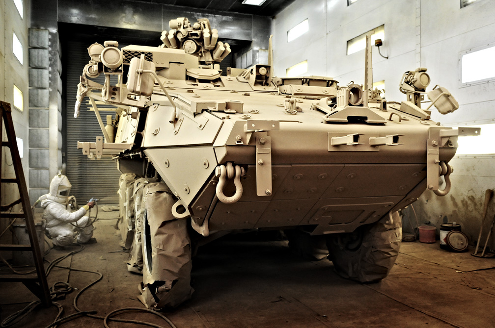 Jagadish Hajam, an auto body repairman and painter from Nepal, applies a coat of Tan 686A on the wheels of a Stryker armored combat vehicle Oct. 3, 2009, inside a booth at Camp As Sayliyah, Qatar. The infantry carrier vehicle was the first vehicle to adopt the new desert tan color in Southwest Asia, in preparation for a planned phase out of the Stryker’s current deep green color.