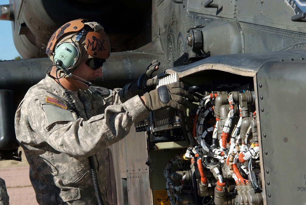 Sgt. Chris Maxwell, Company D, 1st Battalion, 2nd Aviation Regiment, inserts belts of 30 mm bullets into an AH-64D Apache helicopter Oct. 12, prior to gunnery exercises at Fort Carson, Colo. Maxwell was equipping Apache pilots for 13 gunnery scenarios that evaluate attack helicopter teams.