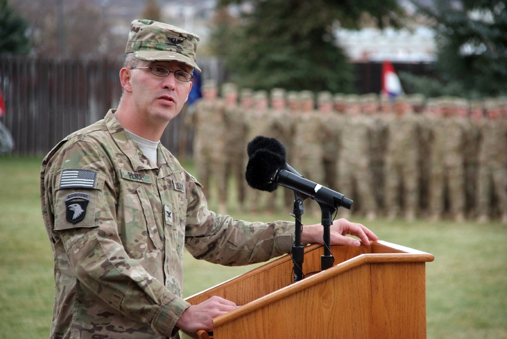 Col. Michael Place, 10th Combat Support Hospital commander, speaks at a deployment ceremony Nov. 4 at Manhart Field, Fort Carson, Colo. Place will travel overseas with Company A, as part of a 10th CSH yearlong mission to provide medical support at forward-operating bases in Afghanistan.