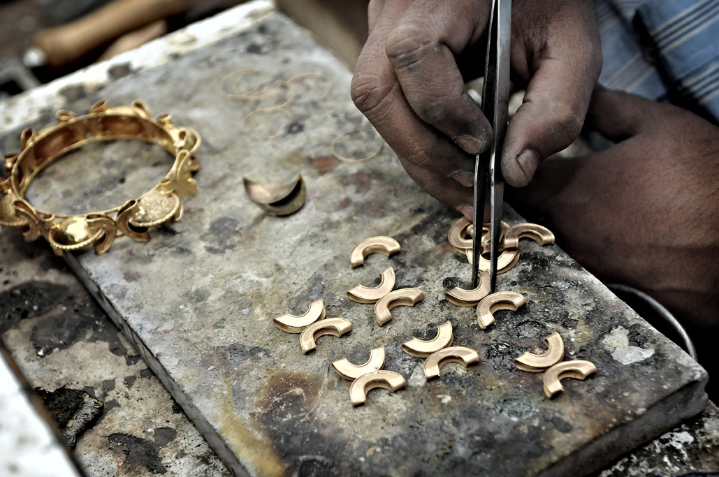 Shajilal Pallikuniyil of Kerala, India, is known as “Jalal” in a loft located above a gold shop in Doha, Qatar. Below the thick concrete floor is a glitzy storefront stocked with over $7 million in gold jewelry, peddled by a half dozen Arab salesmen. Customers never know Jalal is upstairs in a secluded area, but requests for handcrafted jewelry depend on it. Jalal sits slouched at his bench and genuinely focused on his projects – 10 hours a day, six days per week. He works beside two younger cousins. The trio rotates six-month paid vacations to Kerala; respite earned by finishing a year-and-half of work. The craftsmen aren’t required to understand the chemistry involved in applying platinum to produce a white-gold finish. They never balance bullion with copper for harder or less expensive alloys. Their sole responsibility is to shape gold.
