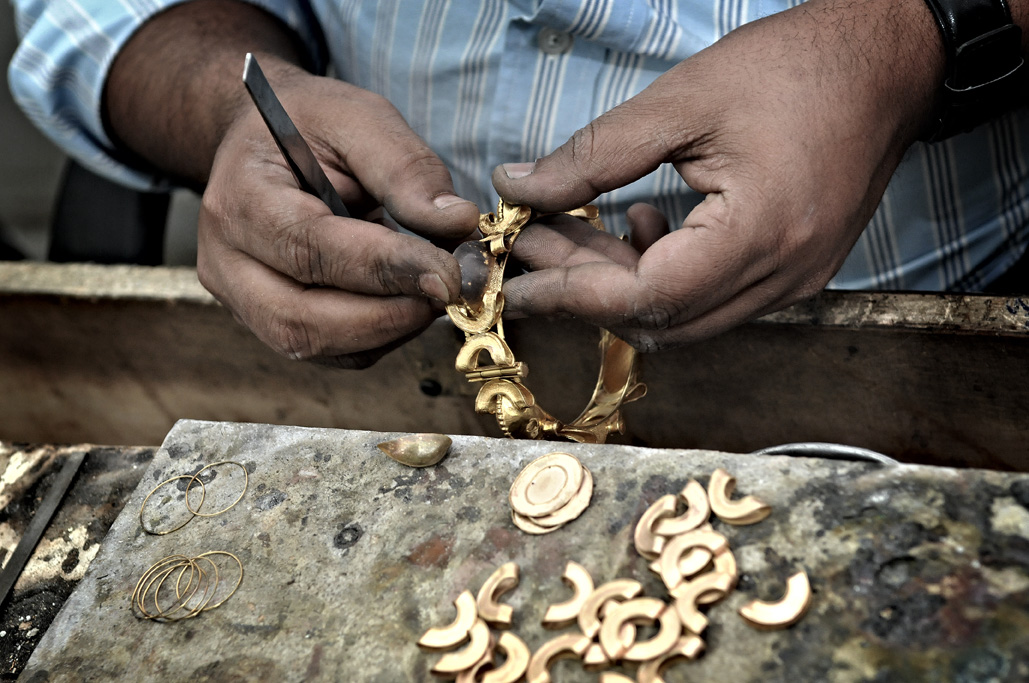Shajilal Pallikuniyil of Kerala, India, is known as “Jalal” in a loft located above a gold shop in Doha, Qatar. Below the thick concrete floor is a glitzy storefront stocked with over $7 million in gold jewelry, peddled by a half dozen Arab salesmen. Customers never know Jalal is upstairs in a secluded area, but requests for handcrafted jewelry depend on it. Jalal sits slouched at his bench and genuinely focused on his projects – 10 hours a day, six days per week. He works beside two younger cousins. The trio rotates six-month paid vacations to Kerala; respite earned by finishing a year-and-half of work. The craftsmen aren’t required to understand the chemistry involved in applying platinum to produce a white-gold finish. They never balance bullion with copper for harder or less expensive alloys. Their sole responsibility is to shape gold.