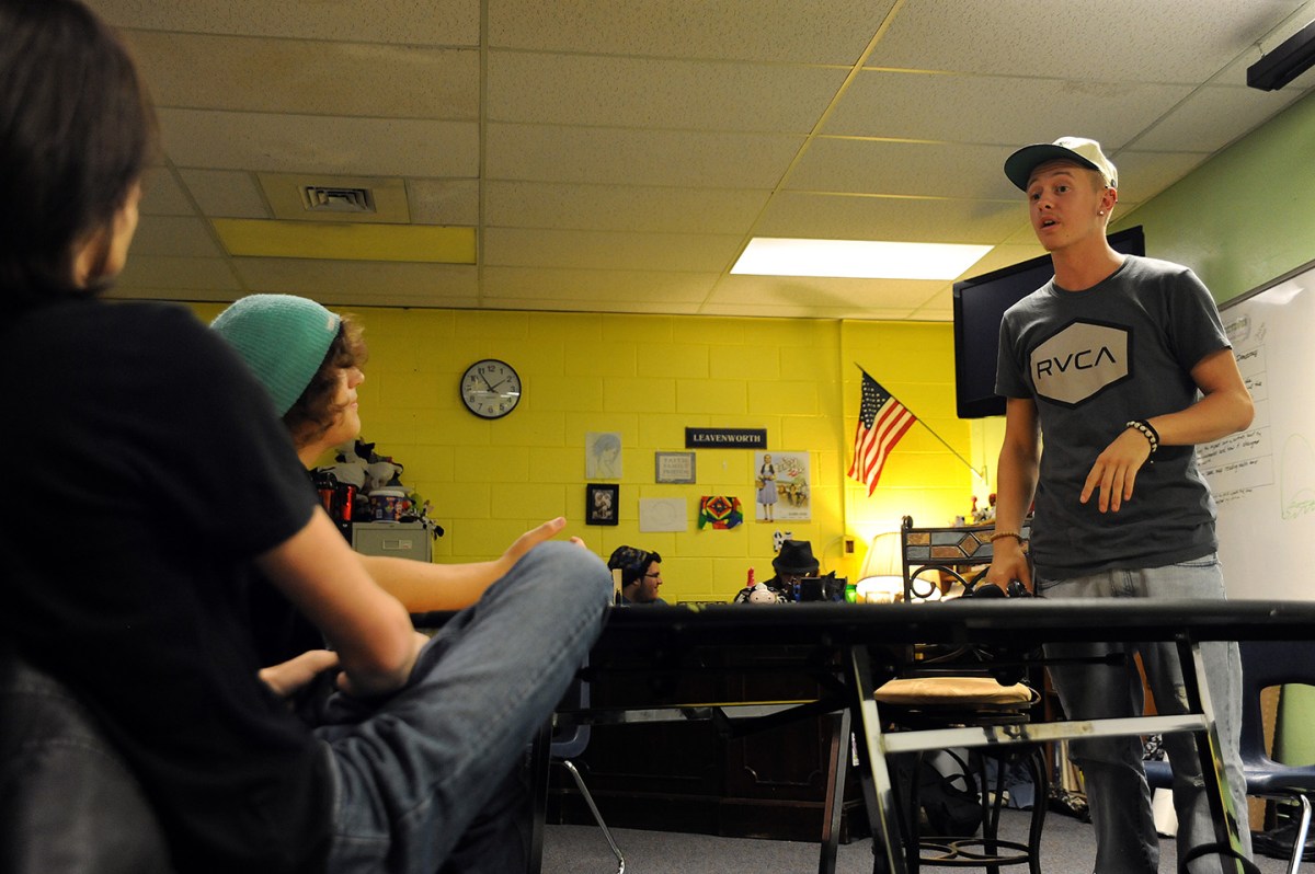 Twelfth grader James Wade, 17, discusses a civil rights project Sept. 11 at Patriot Learning Center in in Falcon School District 49. Wade led the school’s ninth through 12th grade social studies students’ three-day project, combining ideas, materials and artworks. During the 12th anniversary of 9/11, they unveiled their pictorial tribute to the 50th anniversary of Martin Luther King Jr.’s iconic “I Have a Dream” speech, and then reflected on both events.