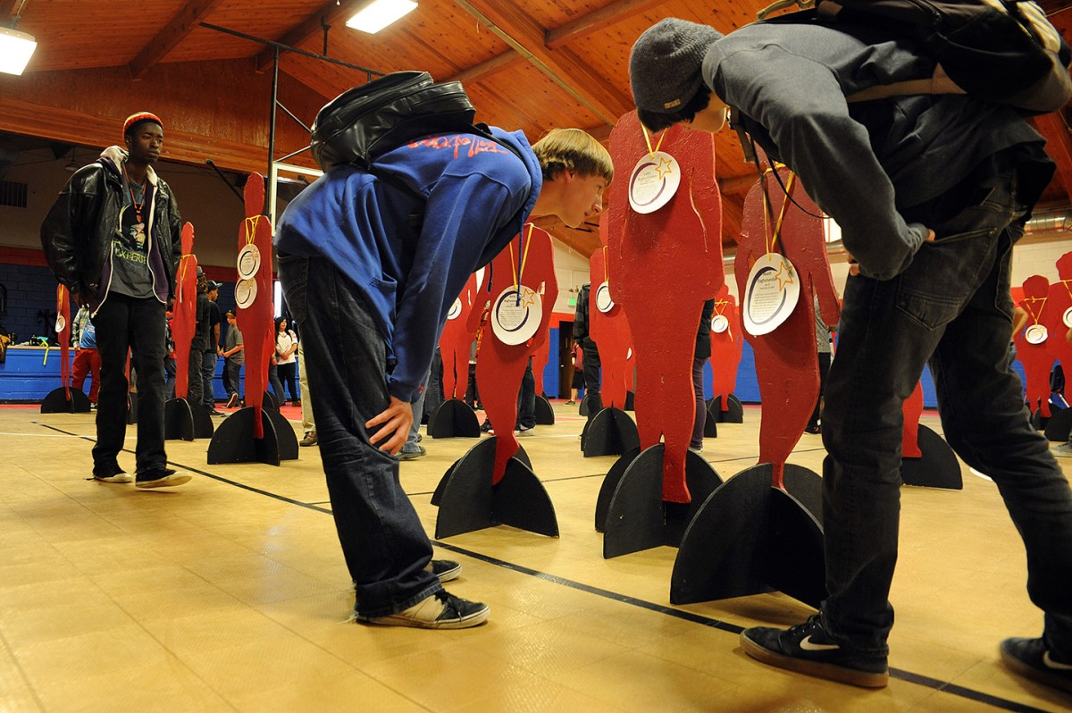 Twelfth grader Ben Joniak, 17, reads a deadly story of domestic violence Sept. 24 at Patriot Learning Center in Falcon School District 49. Lolita Raghunandan, 32, was found murdered Sept. 15, 2003, with her two children. She had obtained a restraining order against her husband, who was out on bond at the time he shot his family. A group of high school students had created tributes for 82 victims of domestic violence in El Paso and Teller counties.
